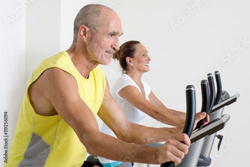 Obraz premium two seniors during spinning exercise