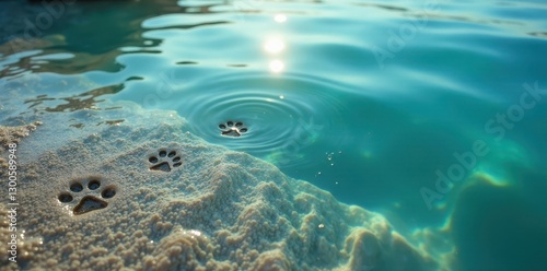 © Busban, Fototapeta premium Two sets of small paw prints, leading into water , summer, water