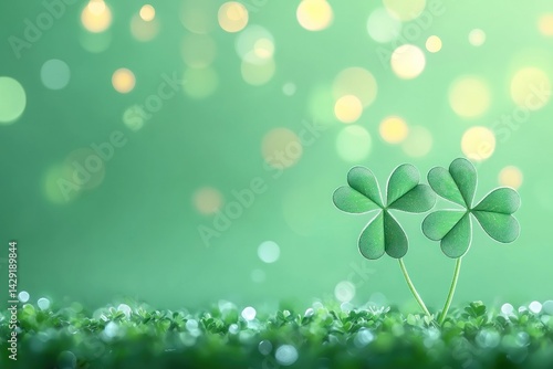© innova, Fototapeta premium Two Shamrocks Growing in Green Grass With Bokeh Lights