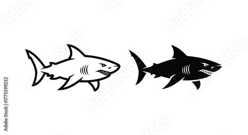 © hasan, Obraz premium Two shark illustrations, one in outline and one in solid black.