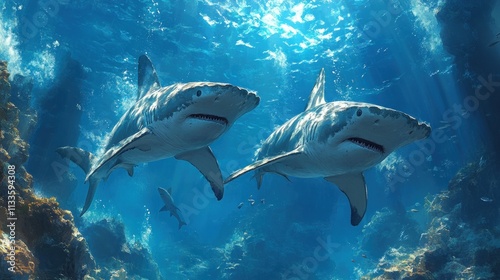 Obraz premium Two sharks swim in sunlit ocean depths.