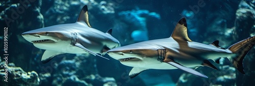Fototapeta premium Two Sharks Swimming Underwater: A Close-Up View