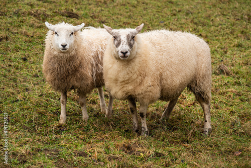 © teddiviscious, Fototapeta premium Two sheep on a green meadow, looking towards camera