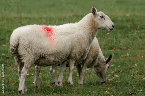 © alan1951, Fototapeta premium Two sheep standing in a field. One has its head lowered eating the grass, the other stands upright looking right