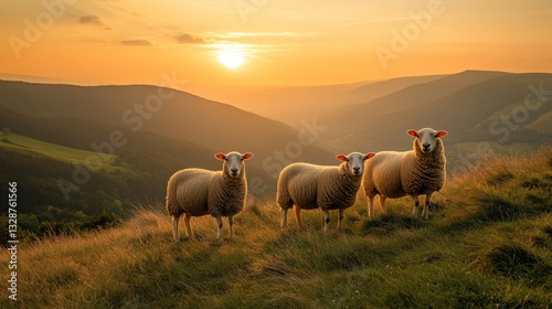 © ANUPONG WANSUKH, Fototapeta premium Two sheep standing on a green hill with a vibrant sunset in the background creating a peaceful rural landscape