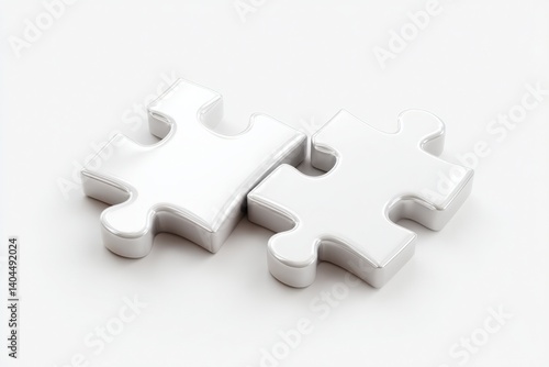 Obraz premium Two shiny white puzzle pieces interlocking on a plain background.