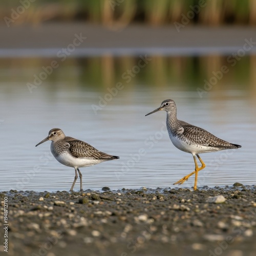 © Reza, Obraz premium Two shorebirds foraging along the waters edge in natural habitat.