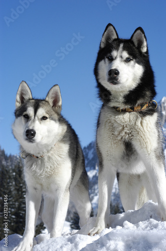 © absolutimages, Naklejka premium Two siberian huskys sitting in a snowy landscape