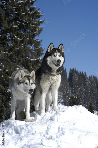 Naklejka premium Two siberian huskys sitting in a snowy landscape
