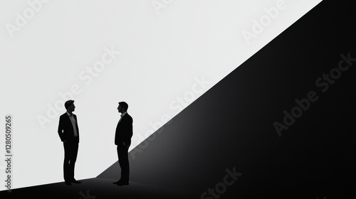 © Anat art, Obraz premium Two silhouetted figures engaged in negotiation against a striking background at an abstract location. Generative AI