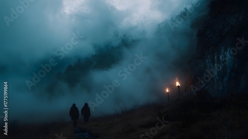 © Thares2020, Obraz premium Two silhouetted figures walk through a misty mountain landscape illuminated by flickering torches at dusk