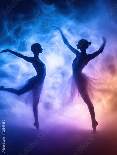 Fototapeta premium Two silhouettes of dancers grace a colorful, smoky backdrop, showcasing...