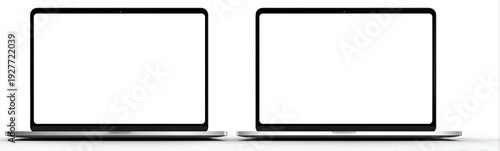 © Eksistensi, Obraz premium Two silver laptops with open screens against a white backdrop. Angled view