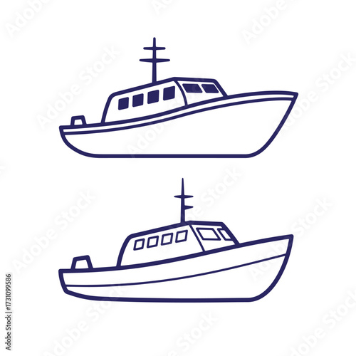 Fototapeta premium Two simplified line art illustrations of motorboats on a white background