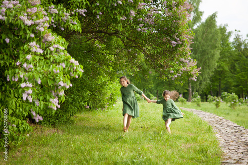 Fototapeta premium Two sisters in green linen dress have fun in the park with blooming lilacs,...
