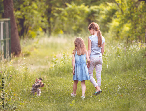 Obraz premium Two sisters playing with little Yorkshire terier sunny day