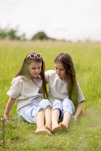 © Маргарита Медведева, Fototapeta premium two sisters sitting on the grass