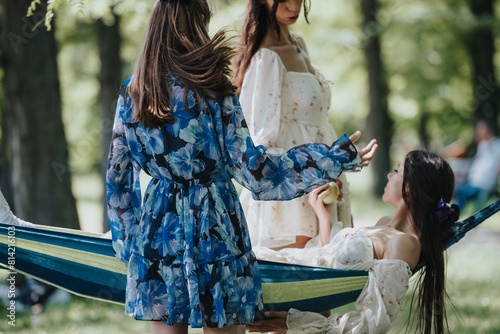 © qunica.com, Naklejka premium Two sisters spend quality time in a park, one reclining in a hammock while chatting with the other, highlighting a bond in a serene setting.