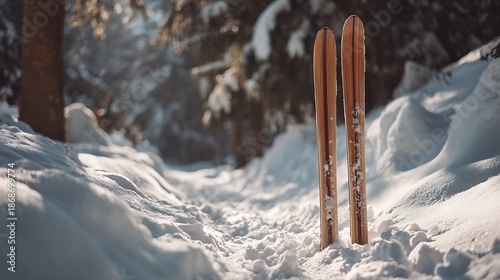 Fototapeta premium Two skis stand upright in deep snow. A snow path leads into a snow-covered...