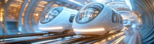 Obraz premium Two sleek, futuristic trains glide through a high-tech tunnel, illuminated by...