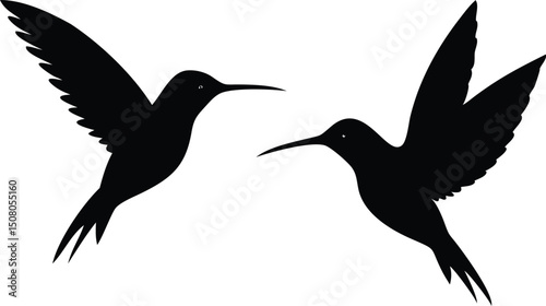 Fototapeta premium Two sleek hummingbird silhouettes face each other, poised midflight on a clean white backdrop