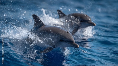 Obraz premium Two sleek playful dolphins leap joyfully from the vibrant blue ocean creating...