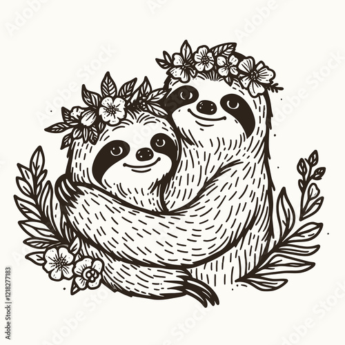 © Supithcha Mani, Fototapeta premium Two sloths embrace, adorned with floral crowns, surrounded by leaves, conveying a sense of love and tranquility.