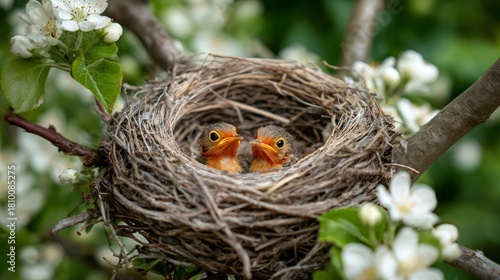 © Анна Мальшакова, Naklejka premium Two small baby birds, or chicks, nesting together in a woven bird's nest. Spring new life and wildlife concepts