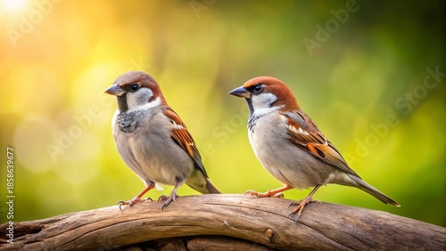 Fototapeta premium Two small birds perched on a weathered branch bathed in warm, soft golden sunlight with a blurred green background