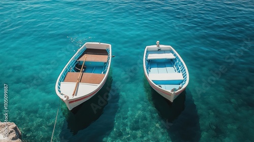 Obraz premium Two small boats floating in clear turquoise water.