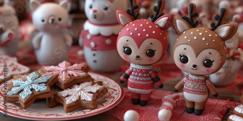 © DSimage, Obraz premium Two small deer and reindeer figurines with Christmas decorations on a wooden surface.
