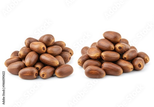 © Vooglo.com, Fototapeta premium Two small piles of brown jackfruit seeds are isolated against a white background in a studio shot