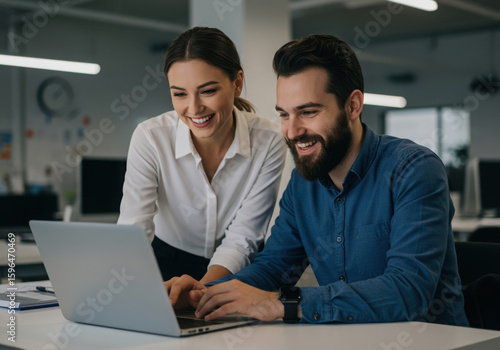 Fototapeta premium Two smiling colleagues collaborating over a laptop in an office