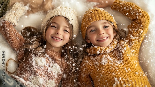 © Raul, Fototapeta premium Two smiling girls lie in the snow wearing winter hats and sweaters with snowflakes on their clothing.