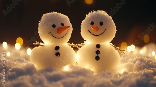 © beda, Obraz premium Two smiling snowmen holding hands in snowy night scene with warm lights.
