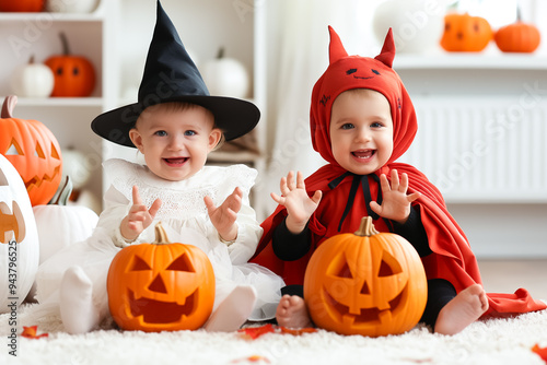 © zamuruev, Fototapeta premium Two smiling toddlers dressed in a witch and devil costume happily pose with carved pumpkins in a cozy room adorned with Halloween decorations
