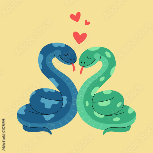 © Alina, Fototapeta premium Two snakes in love sitting together. Romantic reptiles couple with hearts. Vector flat illustration for valentines day poster, banner, greeting card