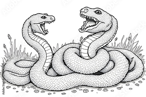 Fototapeta premium Two Snakes Intertwined with Open Mouths in Black and White Illustration