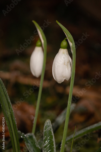 Fototapeta premium Two snowdrop flowers (Galanthus nivalis)
