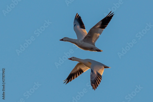 © Jay, Obraz premium Two snowy geese in flight , symmetric as mirror images.