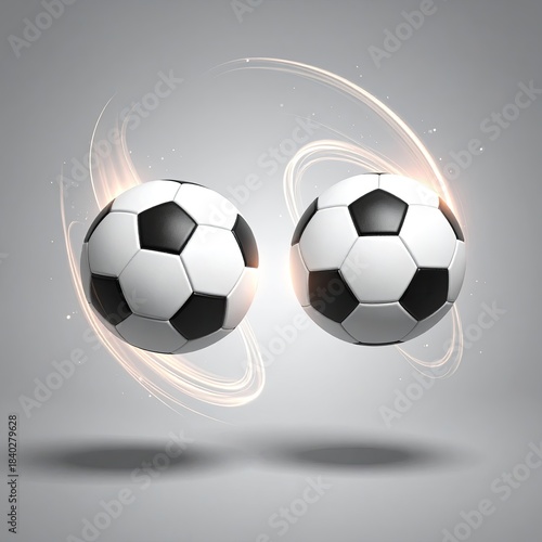 Obraz premium Two soccer balls in motion, encircled by light trails, against a muted gray...