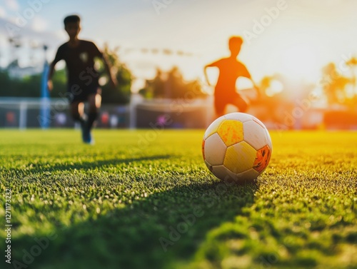 © aiLover, Fototapeta premium Two soccer players are on a field with a soccer ball. One of the players is wearing a black shirt