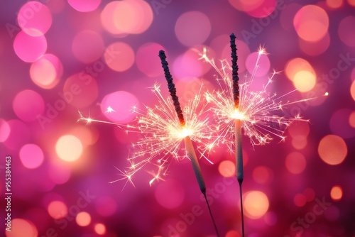 © Jane_S, Obraz premium Two sparklers lit against a vibrant pink and purple bokeh background, creating a warm and celebratory holiday vibe.