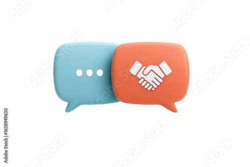 Fototapeta premium Two speech bubbles, one blue with ellipses and one orange featuring a handshake icon, representing communication and collaboration.
