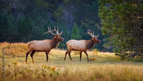© Elara, Fototapeta premium two spike elk wander along the edge of field in cataloochee