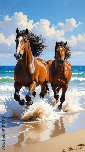 Fototapeta premium Two spirited horses gallop across a sun-drenched beach, their manes flowing in the ocean breeze, as waves crash around their powerful legs.