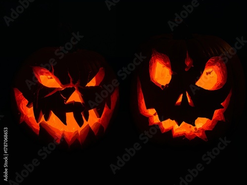 © HooSv, Fototapeta premium Two spooky carved Halloween pumpkins. Glowing jack-o'-lanterns with evil faces isolated on a black background.