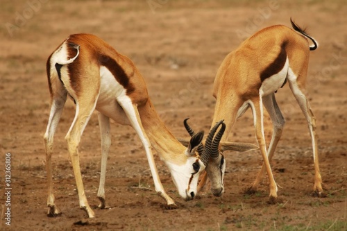 © Honza Hejda, Fototapeta premium Two springboks (Antidorcas marsupialis) males fighting in Kalahari desert.