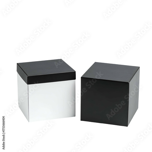 Fototapeta premium Two square boxes; one white with black lid, other black; isolated on black background