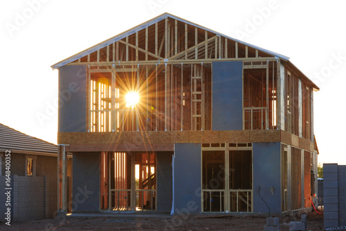 © Eduardo Barraza, Obraz premium Two-story house under construction with exposed wooden framing and sheathing panels, captured at sunrise during the structural phase of residential building in a suburban housing development